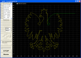 trakcie pracy - wycinania orzełka - które to zadanie jest swoistym testem możliwości maszyny - pianka poliestrowa z powodu swojej miękkości jest stosunkowo trudnym materiałem i w środowisku tapiterów funkcjonuje powiedzenie "jak ci maszyna wytnie orzełka to ci wszystko wytnie"
